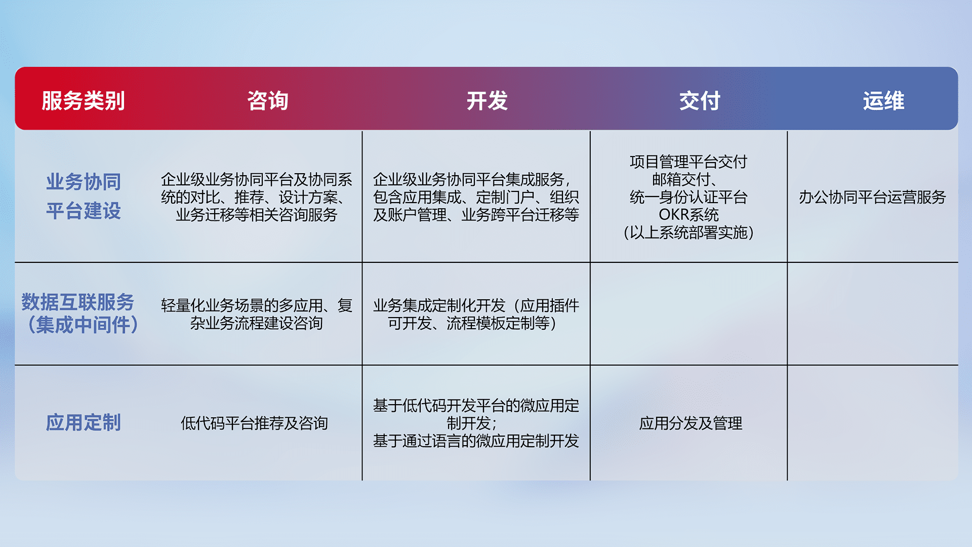 针对钉钉、、、企微、、IDaas等平台级产品提供产品的规划、、、方案、、、、交付、、定制化开发等服务,,,实现如统一协同办公、、智能客户服务、、混合会议管理、、、、智能数据查询、、等业务场景,,,实现数字化转型。。。。